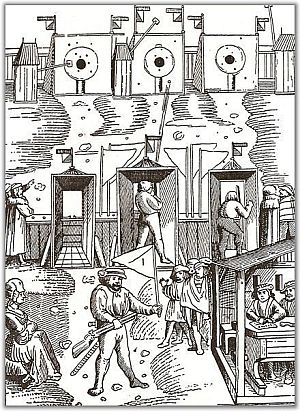 Originele houtgravure uit 1561 van een schietwedstrijd met voorlaad geweren gehouden te Pforzheim in Duitsland. Hoewel we intussen vier en halve eeuw verder zijn, zijn er toch nog een aantal zeer herkenbare elementen terug te vinden: beschermende aanwijzers, schijven, windvanen en het tel bureau.